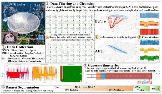In this study, data preprocessing of the FAST feed cabin was conducted to ensure high accuracy and consistency in model training, validation, and testing; the entire process is detailed in Figure 1. The feed cabin’s movement state is complex and variable, encompassing 19 different modes of motion including tracking, source switching, and stationary combinations. This paper focuses on extracting precise data that reflect these primary motion states and appropriately processing them to meet the requirements of deep learning models. By analyzing the motion characteristics of the feed cabin, including Euclidean distance, displacements along three axes, velocity, and acceleration, we precisely extracted data representing tracking, source switching, and stationary states. This process involves filtering based on the duration of motion states using timestamps, particularly for the tracking state, with the following criteria established: