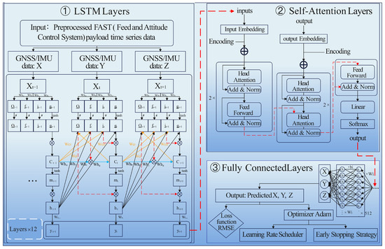 The first part of the model consists of multiple LSTM layers, which handle the long-term dependencies in time series data. LSTM’s key feature is its ability to manage information flow through three gates: the Forget Gate (), Input Gate (), and Output Gate (), which work together to selectively retain or discard information as needed [33,34,35]. The model architecture diagram is shown in the Figure 3. This allows the model to capture both short- and long-term patterns in the data, avoiding the common issues of gradient vanishing or exploding faced by traditional RNNs [36]. In this study, each LSTM layer includes 256 hidden units across 8 layers, enabling the model to extract deep temporal features from the data. The input size for the LSTM layers is set to 3, corresponding to the X, Y, and Z coordinates of the FAST feed cabin. This architecture allows the model to learn from historical motion data of the feed cabin, which is critical for accurately predicting future positions in the event of sensor failure [37,38].