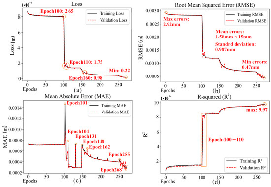 In this model training process, the performance of indicators such as Loss, RMSE, MAE, and R-squared revealed the model’s convergence and optimization. As shown in Figure 5, during the first 100 epochs of training, the model’s Loss significantly decreased to 2.65 , RMSE decreased from 2.92 m to 0.47 m, and R-squared gradually increased, indicating that the model was effectively learning and adjusting its parameters to fit the training data. During this phase, the model quickly transitioned from a random initialization state to progressively learning the data features and reducing prediction errors. Between epochs 100 and 110, the Loss experienced the greatest decrease, dropping from 2.65 to 1.75 . RMSE also decreased rapidly, and R-squared surged from 0.9143 to 0.9847. This suggests that the model achieved a significant learning breakthrough during this phase, possibly resolving a key challenge in the training data and making crucial weight adjustments that substantially improved the model’s fit. From epochs 110 to 160, Loss and RMSE continued to decline, albeit at a slower rate. This gradual deceleration suggests that the model was nearing its optimal state as the extraction of effective features diminished with further optimization. The Loss stabilized around 9.77 , while RMSE and MAE also approached steady levels. After more than 250 epochs, the decrease in Loss was extremely slow, eventually converging at 2.23 . This indicates that the model had essentially converged, having found a reasonably good global or local optimum, with further training yielding negligible improvements in Loss. The mean error was 1.58 mm, well below the target of 15 mm. Although MAE fluctuated during training, occurring at rounds 101, 104, 131, 148, 162, 255, and 268, it ultimately remained at a low error level. R-squared steadily increased throughout the process, ultimately reaching 0.997, indicating that the model had a high explanatory power of variance and predictive accuracy. Moreover, the adjustments in optimization strategies and changes in data feature complexity at critical stages enabled the model to leap from local optima to more optimal regions. After more than 250 epochs of training, the model achieved the desired optimization, realizing the objectives of high accuracy and stability in predictions.