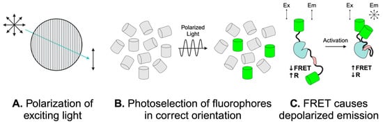 Anisotropy-based FRET strategy. (A) Light, represented by the blue arrow, passes through a polarized filter, so all exciting light is in the same polarization state. Polarization states of light are represented by the intersecting or individual double-sided arrows. (B) The polarized light excites fluorophores, represented as cylinders, in the correct geometric orientation. Fluorophores in the correct geometric orientation that are photoselected and, therefore, excited by the uniformly polarized light are represented in green. (C) In the absence of FRET, emission (Em) from photoselected fluorophores will be in the same polarization state as exciting light (Ex). Upon conformational change of the biosensor associated with activation, FRET to a nearby acceptor fluorophore causes depolarized emission, as measured by a lowered anisotropy (R). Adapted from Snell et al. []. Created in BioRender. Mancini, A. (2024) BioRender.com/l35z225.