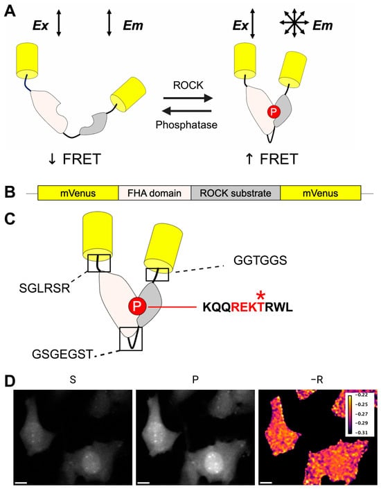 Fluorescence and colorimetric-based assays have been developed for sensing protein localization and activity, biological metabolites, metal ions, and more [,,,,,,,,,,,,]. FRET-based kinase activity reporter (KAR) type sensors have been developed for various kinases, including AKAR for PKA, CKAR for PKC, and EKAR for ERK [,,]. These sensors have proven highly useful in studying cell signaling dynamics [,,,,]. A previous FRET-based KAR-type sensor for ROCK used a two-color FRET approach. However, this sensor showed cross-reactivity to other kinases []. Other approaches available for monitoring ROCK are limited to cell-free methods such as ELISA kits or Western blot of cell lysates, recombinant enzyme assays using phosphosensitive fluorophores, and ATP radiolabeling assays [,,,]. While these cell-free approaches are useful, they don’t allow for quantification of ROCK activity in live cells, don’t offer spatial resolution of ROCK activity at the single-cell or subcellular level, and are not as well time-resolved as fluorescence-based approaches.