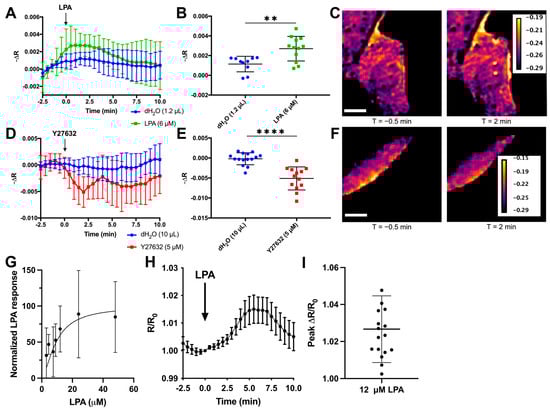 RhoKAR sensor gives a readout of ROCK stimulation and inhibition. (A,B) Time-course change in fluorescence anisotropies in individual NIH-3T3 cells expressing the RhoKAR sensor when stimulated with 6 µM LPA or 1.2 µL dH2O vehicle control (t-test, ** p < 0.01, n = 10 for dH2O, n = 12 for LPA). (C) Representative FRET map image of a cell immediately before and 2 min after LPA treatment. Scale bar = 10 µm. (D,E) Time-course change in fluorescence anisotropies in individual cells expressing the RhoKAR sensor when stimulated with Y27632 or dH2O vehicle control (t-test, **** p < 0.0001, n = 15 for dH2O, n = 13 for Y27632). (F) Representative FRET map of cells immediately before and 2 min after Y27632 treatment. Scale bar = 10 µm. (G) Normalized dose-response of RhoKAR to increasing doses of LPA with curve fit (r2 = 0.02). (H) Increase in RhoKAR anisotropy compared to T = 0 following stimulation with 12 µM LPA. (I) Peak increase in anisotropy compared to T = 0 min after 12 µM LPA stimulation. Created in BioRender. Mancini, A. (2024) BioRender.com/r74d317.