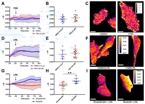 A previous ROCK sensor cross-reacted with PKA, reducing its utility in studying ROCK activity specifically []. To validate that RhoKAR readout is insensitive to PKA activity, 10 µM forskolin (FSK), a PKA activator was used to stimulate cells (Figure 4A). FSK stimulation did not significantly change RhoKAR activity compared to vehicle control (Figure 4B), indicating that RhoKAR is insensitive to PKA activity (Figure 4C). In serum-starved cells, we next inhibited PKA using 150 nM H89 and then stimulated cells with LPA during time-course imaging (Figure 4D). We did not observe significant differences in fluorescence anisotropies between the H89 and DMSO pretreated cells after LPA stimulation (Figure 4E,F), indicating that sensor activity is also insensitive to PKA inhibition.