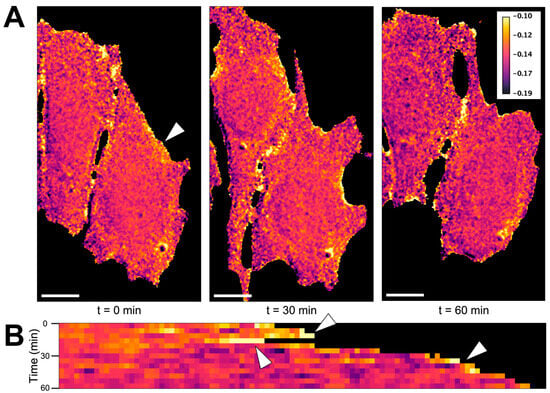 In cells expressing the RhoKAR sensor, time course images at 40X overlaid with a FRET map reveal localized areas of high ROCK activity during cellular retraction and protrusion (Figure 5A,B, Supplemental Video S1). These areas of high RhoKAR activity illustrate the role of ROCK in cellular protrusion and retraction. RhoA’s role in driving changes to cell shape, mainly by modulating the activity and stability of the cytoskeleton, has been of interest for decades [,,]. Because of RhoA/ROCK’s well-characterized role in promoting the active state of the actomyosin contractile apparatus via inhibitory phosphorylation of myosin light chain phosphatase [,,,,,], this localized increase in ROCK activity may be a significant driving force in the cytoskeletal processes pushing forward or pulling back the membrane.