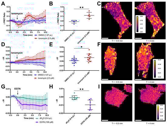 Calcium activates RhoA and ROCK in NIH-3T3 fibroblasts. (A,B) Time course change in FRET in single cells expressing the RhoA two-color FRET sensor shows a significant increase in RhoA activity after ionomycin stimulation compared to DMSO vehicle control (n = 5 per treatment group, t-test ** p < 0.01). (C) Representative FRET map images of cells 4 min after treatment with ionomycin. Scale bar = 10 µm. (D,E) Time course changes in fluorescence anisotropies were calculated for individual cells expressing the RhoKAR sensor after stimulation with ionomycin or DMSO vehicle control. (n = 15 for DMSO, n = 13 for ionomycin, t-test * p < 0.05). (F) Representative FRET map images of cells 4 min after treatment with ionomycin. Scale bar = 10 µm. (G,H) Time course change in fluorescence anisotropy in individual cells expressing the RhoKAR sensor after EGTA or dH2O vehicle control treatment (n = 9 for dH2O, n = 7 for EGTA, ** p < 0.01). (I) Representative FRET map images of cells 4 min after treatment with EGTA. Scale bar = 10 µm. Created in BioRender. Mancini, A. (2024) BioRender.com/p36e974.