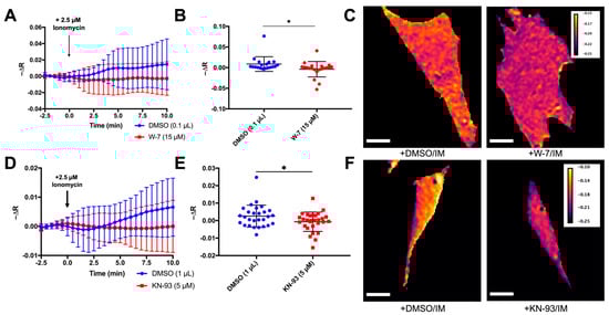Following our observation of calcium-dependent activation of RhoA and ROCK in mouse fibroblasts, we wanted to determine the underlying signaling mechanism. Calmodulin (CaM) is a ubiquitously expressed and highly conserved protein that undergoes a conformational change when calcium binds to any of its four binding sites [,,]. Active CaM in complex with Ca2+ can relieve the autoinhibition of Calmodulin-dependent kinase II (CaMKII), a serine-threonine protein kinase and major effector of CaM [,]. CaM and CaMKII drive many physiological processes, including cytoskeletal rearrangement, apoptosis, and cell proliferation [,,]. Another group has reported that ionomycin stimulation activates RhoA in rabbit aortic vascular smooth muscle and that this stimulation was sensitive to the inhibition of calmodulin but not CaMKII []. Others have observed that CaMKII inhibition blocks RhoA activation following glutaminergic calcium influx in dendritic spines []. To probe the role of CaM in Ca2+-dependent activation of ROCK in fibroblasts, we pretreated cells expressing the RhoKAR sensor with W-7, a CaM inhibitor, or DMSO vehicle control, then stimulated with 2.5 µM ionomycin (Figure 7A). W-7 pretreatment significantly decreased RhoKAR response to ionomycin stimulation compared to DMSO vehicle control pretreatment (Figure 7B,C), indicating that ionomycin-stimulated activation of ROCK requires calmodulin. Next, we chose to look downstream at CaMKII to determine whether calcium-dependent activation of ROCK in mouse fibroblasts requires this effector. KN93, a CaMKII inhibitor, was applied before stimulation with 2.5 µM ionomycin in cells expressing the RhoKAR sensor (Figure 7D). Compared to a DMSO vehicle control, KN93 pretreatment prevented ROCK activation by ionomycin (Figure 7E,F), indicating that CaMKII is involved in RhoA/ROCK activation downstream of ionomycin stimulation and CaM activity in mouse fibroblasts.