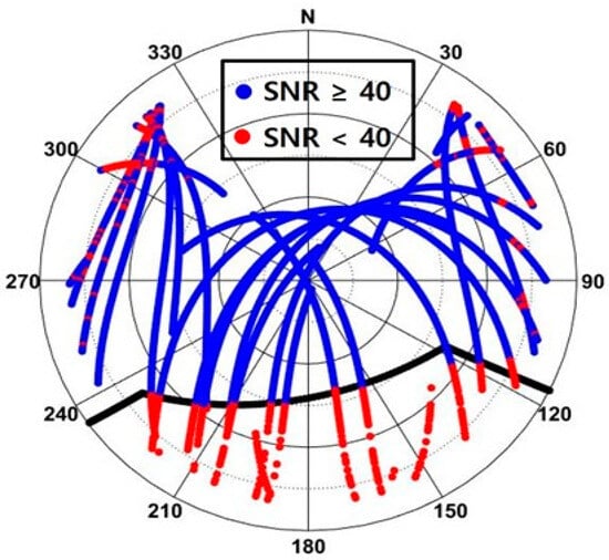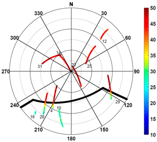 The data were collected for 8 h and 25 min (from 06:35 to 15:00 UTC) on 24 January 2018 at one-second intervals. Figure 2 is a skyplot of the satellite signals received during the 60 min from 06:36 to 07:36. Each PRN number on the skyplot corresponds to the first observation point. SNR values are depicted in color as defined on the color bar. A total of 10 satellites were observed and as expected, satellites with high elevation angles showed larger SNR values.