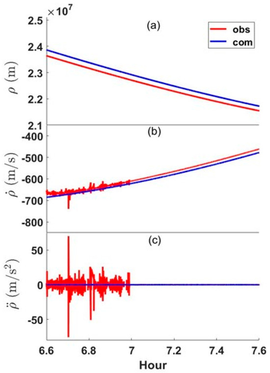 Measurements and computations for pseudorange , range rate , and range acceleration of PRN 26. (a) Pseudorange , (b) range rate , (c) range acceleration . Red and blue lines denote observed (obs) and computed (com) values, respectively.