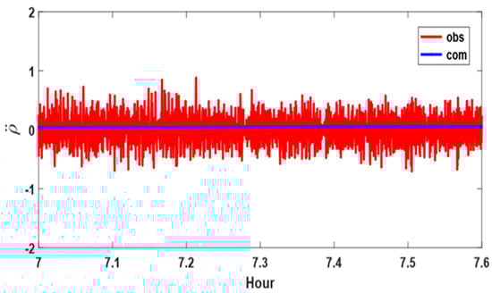 The instability of the RR in Figure 3b and the corresponding index can be used as a weight in the GNSS positioning algorithm. However, it is difficult to decide a specific number for the multipath classification criterion because the RR value depends on the satellite position and the direction of motion, even though it stays within the range from −800 to +800 m/s. What is needed for stable satellite navigation is a reasonable threshold and thus, RR cannot be a suitable candidate. For this reason, we tried the second time derivative of range, or range acceleration, which is the RR time-differentiated again. Figure 3c shows RA computations, where the calculated RA value (in blue) is almost always concentrated on the line = 0 m/s2. On the other hand, the RA values derived from recorded observations (, in red) are close to zero from 07:00 to 07:36 when the LoS is secured. However, RAs rapidly fluctuated with maximum values of ±75 m/s2 when affected by the multipath effect.