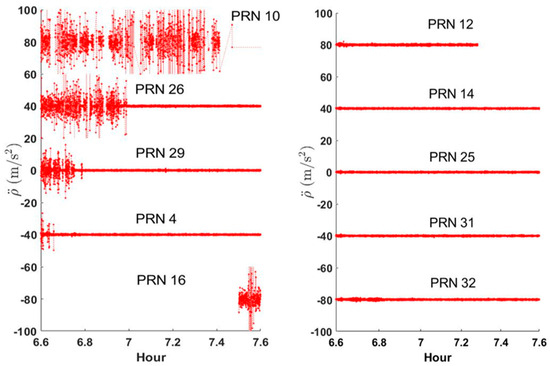 Range acceleration measurements for all 10 satellites observed during the test. Five plots on the left-hand side show satellites affected by signal obstruction (the multipath effect), while five plots on the right-hand side maintained clear LoS vectors. Except for PRN 29 and 25, vertical offsets were applied for clear visual interpretation.