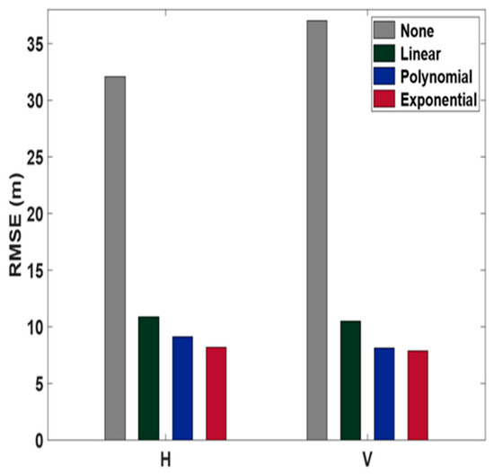 Horizontal (H) and vertical (V) RMSE values from three different weighting models compared with no range acceleration.