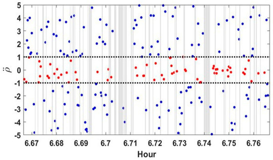 Low pseudorange acceleration values from multipath interference. Values within ±1 m/s2 are denoted by red dots.