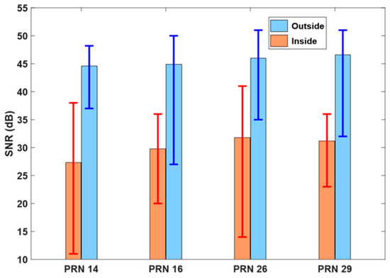 SNR observations inside and outside epochs where the satellite cannot obtain a clear LoS vector. Bar height shows the average SNR value; error bars denote minimum and maximum SNR.