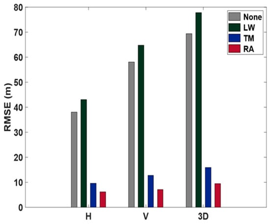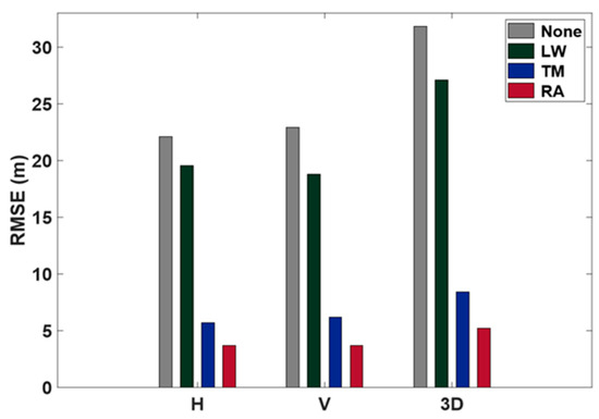 Figure 11 shows that both models improved accuracy, with the TM model being more accurate than the LW model. LW model positioning resulted in an RMSE of 19.5 m horizontally, 18.8 m vertically, and 27.1 m in 3D. In comparison, the TM model showed an RMSE of 5.7 m horizontally, 6.2 m vertically, and 8.4 m in 3D. When no weight was applied, the RMSE was 22.1 m horizontally, 22.9 m vertically, and 31.8 m in 3D.