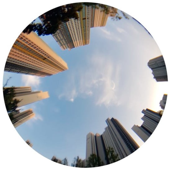 To test the performance of the RA model in an urban setting, we collected measurements in an area with tall buildings. Data were collected every second for 30 min from 04:26 to 04:56 UTC on 19 September 2018. We used the EVK-M8T receiver from u-blox, similar to the setup used on the building roof. Figure 12 is a photo of the site with 40-story buildings in most directions. The outer edge of the photo corresponds to an elevation angle of 20°. It was challenging to secure four or more direct LoS GPS satellites due to the poor reception environment. Therefore, we included BeiDou observations along with GPS to increase the number of navigation satellites. By integrating BeiDou measurements, we had at least 13 visible satellites, which ensured stable data processing. We obtained true values for the receiver coordinates using RTK surveying, and the positioning results were validated by repeating the procedure in the previous subsection.