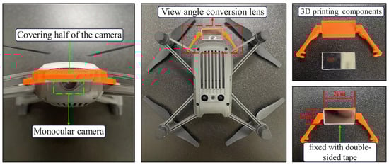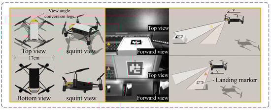 The onboard camera of the DJI Tello MAV can only capture a forward-facing view, and the original body weight is just 80 g. To accomplish vision-based landing tasks, it is necessary to improve the narrow field-of-view of the MAV while ensuring it is not burdened by excessive weight. A lens weighing only 5 g was installed in front of the forward-facing camera, angled at 30° from the horizontal plane, and securely attached to the MAV’s arm. As shown in Figure 1, this lens consists of an optical element and a 3D-printed support, covering half of the MAV camera’s field-of-view.