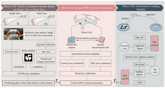 The vision-based MAV autonomous landing framework, as shown in Figure 3, consists of the MAV visual positioning module based on the mirrored field-of-view expansion system, the camera-IMU extrinsic calibration module, and the MAV autonomous landing strategy module.