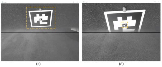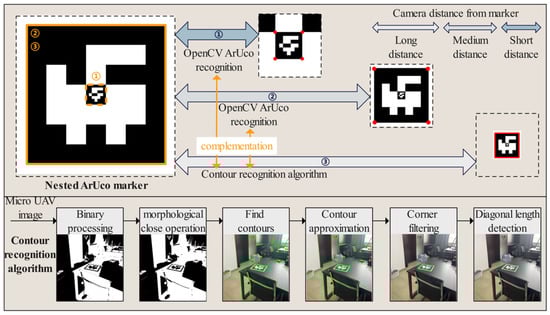As shown in Figure 4, this method divides the ArUco marker recognition process into three stages: far, medium, and near. When the MAV is far from the ArUco marker (The distance is more than 30 times the size of the external target), the recognition rate of the ArUco marker by the OpenCV algorithm is relatively low. During this stage, the primary approach is to use the marker contour extraction method to extract the outer contour of the marker and obtain its four corner points. When the MAV is at a moderate distance from the ArUco marker (The distance is 5–30 times the size of the external marker), the recognition rate of the ArUco marker by the OpenCV algorithm increases. The contour extraction algorithm is used during gaps where the OpenCV algorithm fails to recognize the marker, thereby improving the overall recognition success rate. When the MAV is close to the ArUco marker (The distance is less than 5 times the size of the external marker), the OpenCV algorithm will recognize the inner ArUco marker. In actual flight, the switching between the three recognition stages is not simply set according to the range of distance, but a detection priority is set. The recognition priority of the external marker is higher than that of the internal marker, and the priority of the OpenCV algorithm is higher than that of the method of extracting the outline of the marker. Therefore, there is no computational redundancy caused by the simultaneous recognition of external and internal markers, which enables smooth switching between stages.