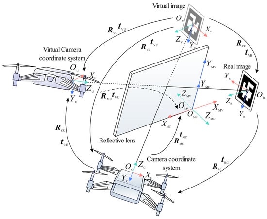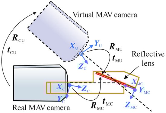 As shown in Figure 6, the installation angle and position of the planar mirror relative to the MAV camera are known, allowing the calculation of the rotation and translation from the camera coordinate system to the front side of the planar mirror coordinate system . The equations are as follows:
