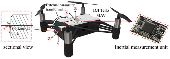 In the previous section, the pose transformation from the landing marker to the MAV camera was solved, allowing us to obtain the spatial position of the landing marker relative to the camera’s coordinate system. However, relying solely on this position information for landing localization is challenging. Therefore, we need to transform the coordinate system, converting the position of the landing marker from the camera’s coordinate system to the body coordinate system. To achieve this, we must determine the extrinsic pose transformation relationship between the camera and the body. This transformation cannot be directly estimated by eye, as the forward-facing camera of the MAV, such as the DJI Tello used in this study, does not have its optical axis perpendicular to the body. Instead, the camera is slightly tilted downward, as shown in Figure 7. Hence, a more accurate method is required to estimate the camera-to-body extrinsic parameters. Since the IMU’s coordinate system is typically aligned with the UAV body, with the origin representing the center of the MAV body, we extend previous research methods by employing camera-to-IMU extrinsic calibration techniques [27] to solve the MAV camera-to-body extrinsic estimation problem.