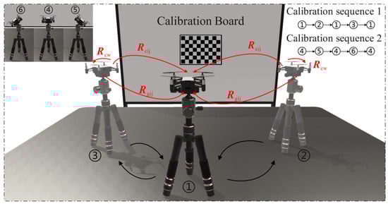 When calibrating the extrinsic parameters between the camera and IMU, the MAV needs to be fixed on a tripod and placed in front of a checkerboard calibration board. Both the camera and IMU are operated simultaneously, and data are collected by following the motion trajectory 1-2-1-3-1, as shown in Figure 8, with the camera’s optical axis always facing the calibration board. To introduce rotation in multiple directions, data are further collected following the trajectory 4-5-4-6-4. During this process, the IMU records attitude data of the MAV and calculates the attitude changes within the motion intervals. The camera captures images of the calibration board at stationary moments, and by identifying the corner points of the checkerboard calibration board, the pose of the calibration board relative to the camera is determined using the PnP algorithm. The host system receives the IMU’s attitude data to identify the motion-stationary critical points of the calibration process, distinguishing the motion intervals. As shown in Figure 8, and represent the changes in attitude of the camera and IMU during a single motion interval, and represents the fixed relative pose between the camera and IMU. Finally, by integrating the attitude changes in the camera and IMU over multiple motion intervals, the extrinsic parameters between the camera and IMU are calibrated using the hand-eye calibration algorithm.