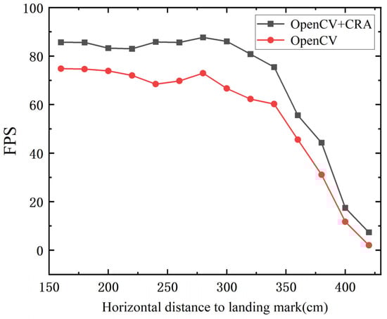 The coarse-to-fine MAV pose estimation algorithm mainly consists of two parts: landing marker recognition and pose estimation. Since the pose estimation algorithm transforms input image point coordinates into an output extrinsic matrix, its computation speed is relatively stable. However, the performance of landing marker recognition is influenced by factors such as the size of the marker, flight altitude, and horizontal distance, resulting in variations in recognition performance. Therefore, the recognition performance of the landing marker is crucial. To verify the performance of the fusion between the OpenCV ArUco marker recognition algorithm and the Contour Recognition Algorithm (CRA), the MAV was fixed on a tripod at a height of 150 cm, and an ArUco landing marker with an outer size of 25 cm × 25 cm was placed horizontally on the ground. The MAV was positioned horizontally at distances ranging from 160 cm to 420 cm from the center of the landing marker, with measurements taken every 20 cm. The average frame rate of successful recognition over 30 s was monitored as a performance evaluation metric. As shown in Table 1 and Figure 10, the fusion of the OpenCV ArUco marker recognition algorithm and the Contour Recognition Algorithm (CRA) resulted in a noticeable improvement in recognition rate compared to using the OpenCV ArUco marker recognition algorithm alone, with an average frame rate increase of 12.55 FPS.