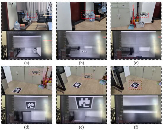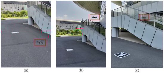 The MAV is placed at a location far from the landing marker for takeoff. It is manually flown to an area where the landing marker can be captured in the forward view, issue an autonomous tracking command to the MAV immediately, after which it enters the autonomous landing phase. As shown in Figure 11, images (a) to (f) illustrate the complete process of the MAV’s autonomous landing.