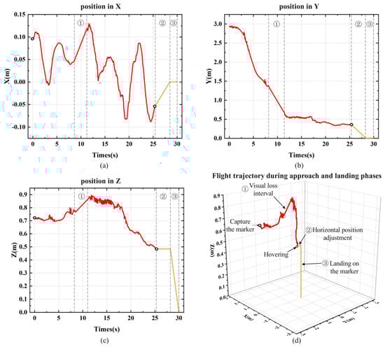 The flight trajectory of the MAV’s indoor autonomous landing experiment: (a) X-axis position; (b) Y-axis position; (c) Z-axis position; (d) three-axis flight trajectory during the approach and landing phases.