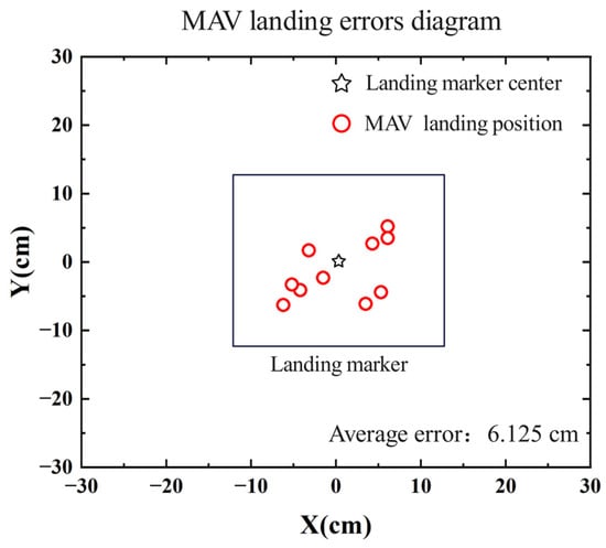 As shown in Figure 13, in the ten consecutive landing experiments, the MAV successfully landed on the landing marker each time, with an average error of 6.125 cm, indicating a certain level of stability in the autonomous landing method. In Table 1, the average time consumed across the 10 experiments is 33.52 s, with Steps 1 and 2 accounting for the largest portions of the time. The maximum time consumed for Step 1 is 20.71 s, with an average of 16.42 s, while Step 2 has a maximum of 14.61 s and an average of 11.56 s. The main reason for the time variance is that when the MAV camera first captures the landing marker, the marker is often off-center in the camera’s view. This results in the MAV needing to adjust its X-axis position during the approach or descent. The greater the initial offset, the more time is required to correct the position during the approach or descent. The time consumed in Steps 3 and 4 is relatively similar.