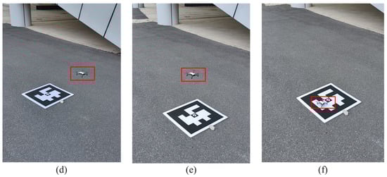 The process of the MAV’s outdoor autonomous landing experiment: (a) takeoff process; (b) hovering after increasing flight altitude; (c) autonomous landing approach process; (d) descending process; (e) move to the position above the marker; (f) vertical landing.