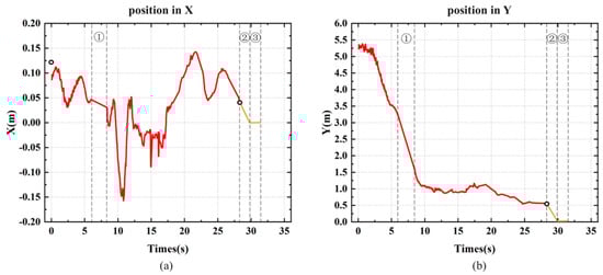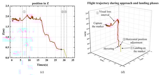 During the experiment, the X, Y, and Z axis coordinates of the landing marker’s center relative to the MAV’s coordinate system were recorded. Starting from the moment the MAV began autonomous landing, the time corresponding to the coordinate information of each frame was also logged. Figure 12 shows the position visualization curve from one of the landing experiments. Section 1 represents the visual loss interval, which occurs when the landing marker is in the blind spot between the forward and top views during the MAV’s approach, as shown in Figure 11c. In this interval, the MAV temporarily loses its localization and continues to approach the landing marker with the same speed and direction as before the loss, until the marker reappears in the top view. Section 2 represents the horizontal adjustment process before the MAV descends vertically. By calculating the average X and Y axis coordinates during hovering, corresponding displacement commands are sent to the drone. Once the MAV is horizontally aligned above the center of the landing marker, it enters Section 3 for the vertical landing process.