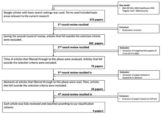 Following the procedure proposed in [], the research questions were used to define a list of keywords to be used for search queries. The following is the defined search query: “(Explainable AI OR XAI) AND (Interpretable ML OR IML) AND Healthcare AND (“Digital Twin” OR DT) AND security”. Then, related research papers were downloaded using the selected string of keywords. Google Scholar was selected as our data source. As suggested by [], using Google Scholar as the main web search engine helps avoid bias towards any specific publishers. Only English papers published between 1 January 2013 and 1 December 2023 were included.