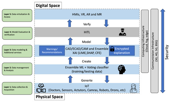 Figure 2 depicts the five layers of the Digital Twin framework. The figure is adapted from [,,,] and updated. Physical space data are collected by Layer 1 via wearable devices, cameras, and medical records. Collected data are managed and processed in Layer 2 using AI/ML algorithms to prepare data for Layer 3. An ensemble of ML algorithms with a voting classifier can be used for capturing different features, improving accuracy, and detecting errors. In Layer 3, XAI has been added as an additional service along with data modeling technologies, such as ECAD, and CAM. The explanation of the created model is important for healthcare practitioners and cybersecurity experts for the reasons that have been discussed above. Reference [] states that understanding the explainability of the AI/ML algorithms used in the DTs framework from the decision-making aspect is crucial. Also, XAI is important for updating DT frameworks, which is a key component that is not considered in ordinary simulations. Thus, an ensemble of XAI tools can be employed in Layer 3 to provide different levels of explanations (i.e., global and local), which can be used to generate warnings if there is a disagreement. Layer 3 not only models the collected data, but it provides the reasoning behind its decisions using the XAI tools and warnings based on the generated explanations. A new layer was added between Layer 3 which produces a model of the physical space and the virtualization in Layer 5. Evaluating the generated warnings or recommendations from Layer 3 requires a certain amount of human work, although this may be costly and time-consuming []. Also, ref. [] states that for some practical tasks (e.g., medical diagnosis) humans need to verify labeled data. Hence, the integration of the human-in-the-loop (HITL) approach in the DT’s architecture is crucial. To the best of the author’s knowledge, this is the first study that integrates XAI and HITL into the DTs architecture and proposes a security layer for verification.
