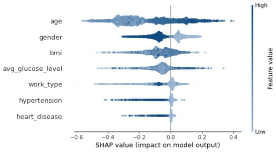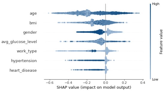 Figure 5 shows that feature importance order has changed as BMI is replaced by avg_glucose_level. Also, Figure 6 depicts an order change in the feature importance for the SHAP explainer. Gender becomes the second most important feature instead of BMI. LIME explainer Table 14 ranks gender and work_type as the most important features, which is different from the original ranking. Moreover, work_type replaces BMI in the ELI5 explanation Table 15.