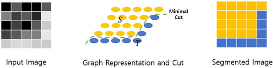 The background of an input image is removed to reconstruct only useful information by leaving only chili peppers in the image. The technology used is GrabCut [20]. GrabCut [20] is an algorithm based on the division of regions through the minimal cut algorithm used in the graph algorithm. Segmentation is possible by assuming the pixel of the image as the vertex of the graph and dividing it into foreground and background groups to find the optimal cut. The GrabCut process is shown in Figure 1.