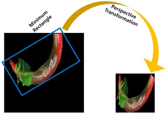 The input of the deep learning network is the image of the chili pepper region from which the background has been removed. Preprocessing is required to distribute the chili pepper regions in the best state. After removing noise and filling holes in the image through mathematical morphology, the minimum bounding box rotated by the angle to include the minor background area is found. An input image with a size of 128 × 128 is generated through a perspective transformation in this rectangle area, and the process is shown in Figure 2.