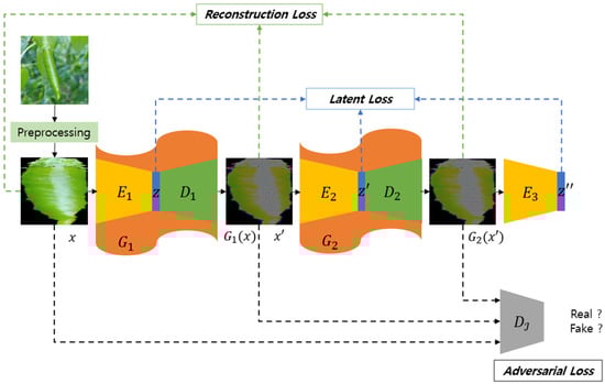 Research in disease diagnosis can be conducted using GAN-based methods, but due to challenges in achieving a high performance, most studies predominantly employ CNN-based classifiers or object detection frameworks. DoubleGAN [14] proposed a GAN structure to detect diseases in plants. This research consists of two steps. Step 1 uses both normal and diseased plants, and, based on WGAN [15], data augmentation is carried out using a pretrained model. Subsequently, in Step 2, the number of diseased leaves data is expanded by increasing the image size by 16 times using SRGAN [16]. It uses several extended GANs to improve the performance. Punam Bedi et al. [17] proposed a hybrid model for detecting plant diseases by combining a Convolutional AutoEncoder (CAE) and a CNN. This creates a network that can reconstruct images through the CAE structure and simultaneously focuses on the compressed domain representation, the output of the encoder. This domain is a latent vector used by the CNN to classify normal or diseased plants. This study achieved a high performance with the training of only 9914 parameters. Sharath D. M. et al. [18] proposed a framework for detecting plant diseases using data preprocessing and a CNN for the image processing. They used the GrabCut segmentation method proposed by Yubing Li et al. [19] for background removal, which improves upon the GrabCut [20] technique.