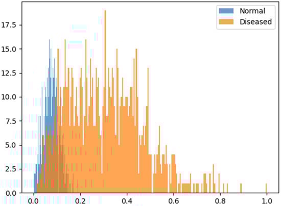 The blue bar represents the score distribution of the normal pepper image, and the orange bar represents the score distribution of the diseased chili pepper image. Overall, each distribution shows a normal distribution with a convex middle region, and the maximum value of the normal chili pepper image does not exceed 0.2 and shows a result close to 0. The expected outcome in analyzing images depicting diseased peppers is that the results should closely approach a value of 1. However, the observed results are uniformly distributed across the interval [0,1], leading to overlapping distributions. Binary classification uses the optimal threshold to distinguish between normal and diseased. As mentioned in Equation (8), if it is less than τ, it is considered normal; otherwise, it is considered diseased. The optimal threshold is calculated to 0.1402.