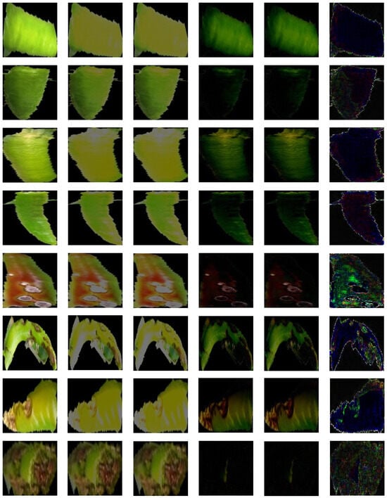 Figure 6 shows the results of the proposed method: column 1 shows the original image and columns 2 and 3 show the results output by the generator. In addition, lines 1 to 4 show the results of the normal chili pepper image, and lines 5 to 8 show the results of the diseased chili pepper image. The difference between the original image and the generated image is blurred or different in color, showing results that cannot be reconstructed in detail. It can be seen that the difference between and is not significant as a visual result.