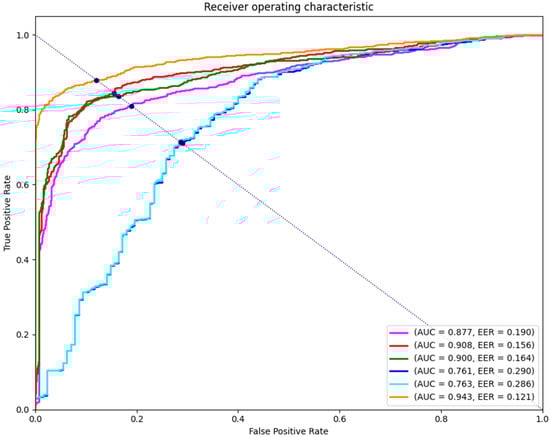 Figure 7 shows the ROC curve for the six score calculation methods. The blue and cyan graphs show the results for and . The two results show a very slight difference on the graph. The AUC is 0.761 and 0.763, which is significantly lower than other score calculation methods. The magenta, red, and green show a graph of the scoring method using a latent vector and show results that are significantly higher than scoring based on the image. Magenta is the graph of , red is the graph of , and green is the graph of , of which shows the best performance. The methods proposed in this paper are the highest performance methods with the highest AUC 94.3% compared to the other methods.