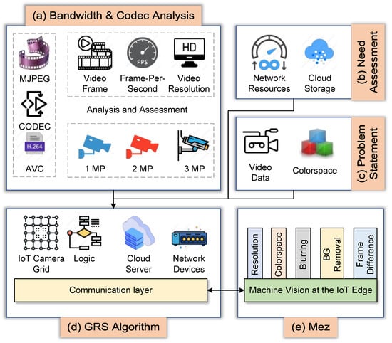 Integrating machine vision into the IoT camera efficiently processes video frames before transmitting them, reducing bandwidth consumption and storage costs. However, it is challenging to maintain harmony among numerous IoT cameras, form a surveillance grid, and optimize bandwidth and storage. The Mez is a promising technology that can achieve this; however, its application domain is limited to a single IoT node. Besides, it is developed for latency-sensitive applications. The proposed methodology modifies the Mez architecture, develops a novel Grid Sensing (GRS) algorithm, and extends the capability of Mez technology to be adapted to a massive IoT camera grid for bandwidth and storage cost optimization. The overview of the proposed methodology has been illustrated in Figure 1. It starts with the bandwidth and codec analysis mentioned in Figure 1a. The insights discovered from this analysis have been used in the methodology. After that, the need assessment was performed along with problem statement analysis, which is depicted in Figure 1b,c. The elements and communication layers of the proposed GRS algorithm and Mez technology are marked as Figure 1d,e.
