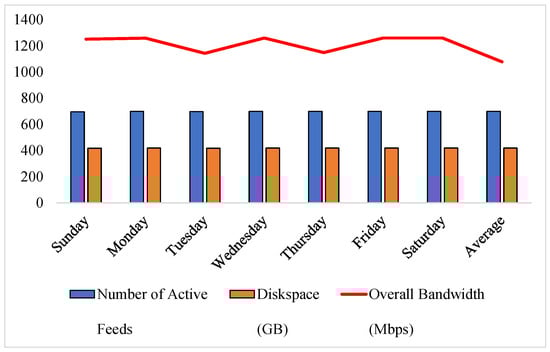 Data in Table 2 show the statistics of the number of active feeds, disk space, and overall bandwidth for each day of the week for the experimenting environment. It reveals that the number of active feeds remains consistently high throughout the week. Furthermore, the overall bandwidth consumption fluctuates between 1153 Mbps to 1260 Mbps. It is evident from Table 2 that the average disk space for 699 active camera feeds per day is 419 GB, which requires an average bandwidth of 1078 Mbps. According to Equation (4), where n is the total required disk space, and m is the number of days, is the disk space of i-th day, and the experimenting environment requires 12,570 GB of disk space: