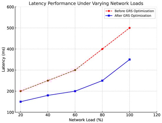 Latency is a critical QoS parameter for real-time surveillance applications. In our experiments, we observed that under low-to-moderate network load conditions (up to 80% bandwidth utilization), the system maintained an average latency of under 200 ms. When network traffic increased beyond 80%, the GRS algorithm dynamically reduced the resolution (Knob 1) and frame rate (Knob 5) to prevent further latency increases. As a result, the system was able to maintain real-time transmission even during peak loads, with a maximum observed latency of 350 ms, as shown in Figure 4.