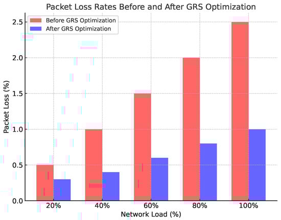 Packet loss was monitored during the experiments to evaluate how the GRS algorithm responded to network congestion. The system applied color space conversion (Knob 2) and frame difference calculation (Knob 5) to minimize the impact of packet loss on video quality. Our results showed that packet loss remained below 1% across all traffic load scenarios. Figure 5 illustrates that packet loss increased slightly during peak traffic periods but was mitigated by the adaptive adjustments of the GRS algorithm.