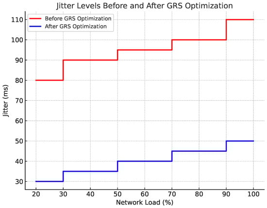 Jitter, or the variability in packet arrival times, is another crucial metric for ensuring smooth video playback. During periods of high network load, the GRS algorithm applied blurring (Knob 3) and background removal (Knob 4) to reduce the video file size and stabilize the data transmission rate. The results in Figure 6 show that jitter remained below 50 ms across most conditions, with minor fluctuations during peak loads. The system effectively reduced jitter by dynamically adjusting video quality, ensuring a smooth viewing experience.