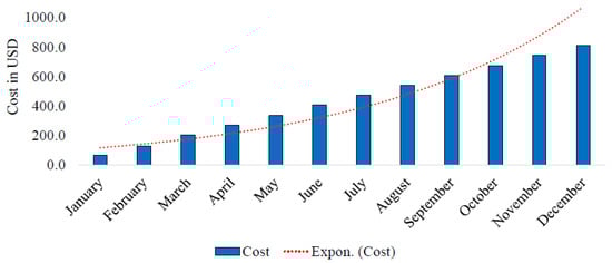 The Mez technology reduces the storage demand by 94 GB per day. Over a month, it saves 2820 GB of disk space. In the pay-as-you-go scheme, the cost of 2820 GB of storage is USD 67.68. If the videos are not removed and additional storage capacity is acquired, the monthly cost is accrued with the previous month’s cost. If the current month’s expenditure for storage is USD 67.68, then the expenditure in the next month will be USD 135.36. In the third month, it will be USD 203.04. This is how the storage cost keeps increasing. The accrued cost of storage over the period of twelve months becomes USD 5270.0. The cumulative cost characteristics have been illustrated in Figure 7. The application of the proposed technology eliminates the need for an additional 33840 GB of disk space, saving USD 5270.0 yearly.