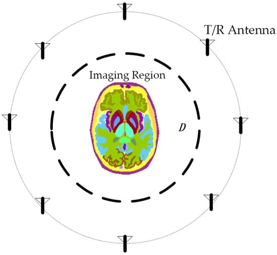 Schematic diagram of microwave tomography. The brain is used as an imaging target, and antennas arranged around it can transmit and receive microwave signals.