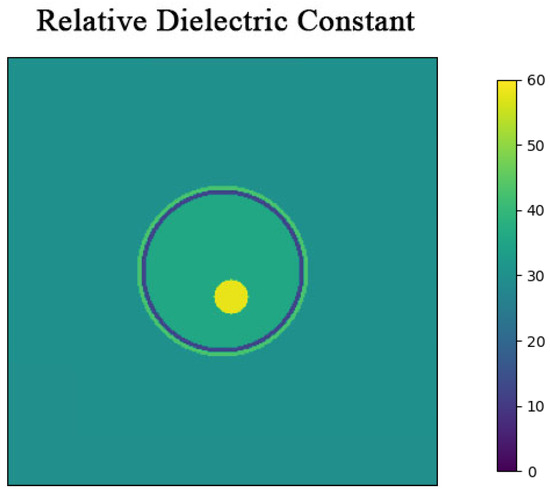 To evaluate the performance of the Born Iterative Method based on error optimization, a simplified three-layer brain model with a radius of 10 cm was developed. The human brain comprises various tissues, including brain tissue, skull, and skin. When microwaves irradiate the brain, they traverse these tissues sequentially. Therefore, in simulations, the human brain model is often simplified into a skull model with multiple nested layers. The three-layer human brain model used in this study, from the outermost to the innermost, includes the following: a skin layer, a skull layer, and a brain layer. Figure 2 illustrates the nested structure of the three-layer brain model. The complex relative permittivity of the brain layer is calculated using the Fourth-order Debye model [29].