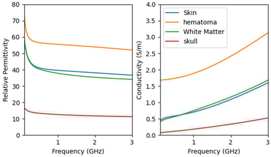 The specific values of the electromagnetic properties of each tissue in the human brain model are shown in Figure 3. The microwave frequency band used spans from 0.5 GHz to 2 GHz, covering a total bandwidth of 1.5 GHz, with 201 points sampled at equal intervals. Too high a frequency will decay quickly in organic media, resulting in excessive noise that affects imaging performance.