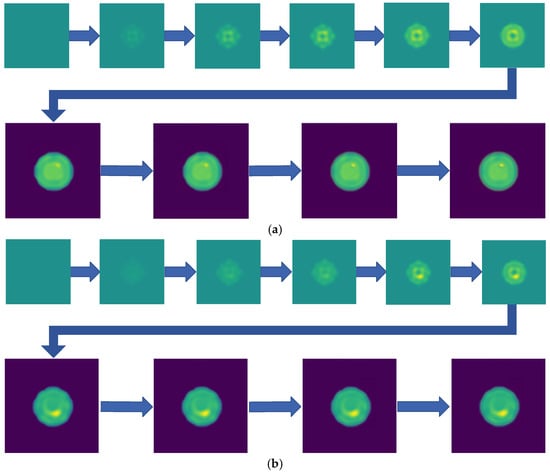 Imaging results with hematoma. (a) Imaging result of a hematoma at (1, 3); (b) Imaging result of a hematoma at (1, −3). The first two rows are the preliminary iteration part of 100 × 100 resolution, and the second row is the process of using the mask array to perform a second iteration on the edge position after increasing the resolution to 200 × 200.